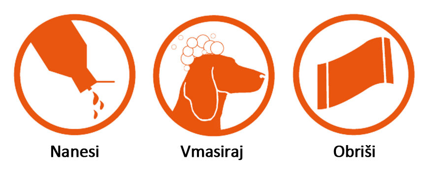 Nanesite prijazno in nežno tekočino neposredno na dlako/kožuh, masirajte, da se dobro speni in tako razgradi vso umazanijo in maščobo, nato pa temeljito osušite z brisačo. Kožuh ostane mehak in čist.